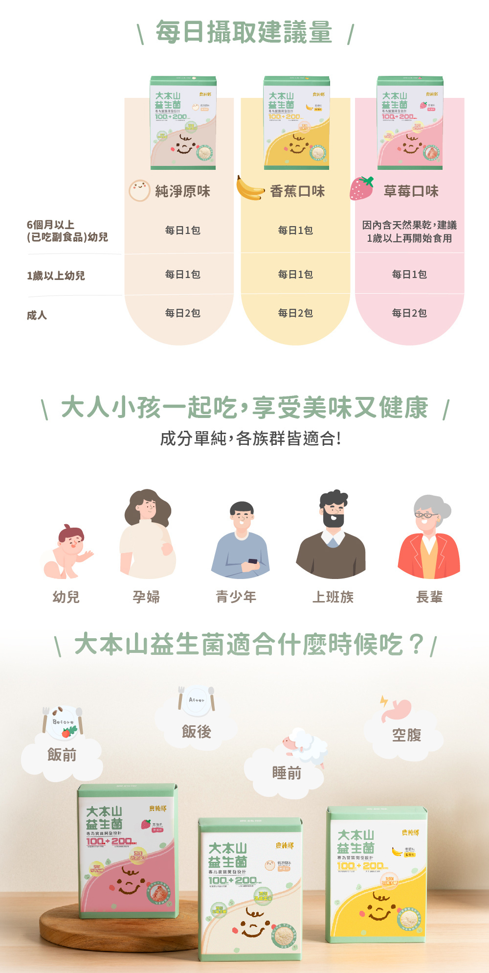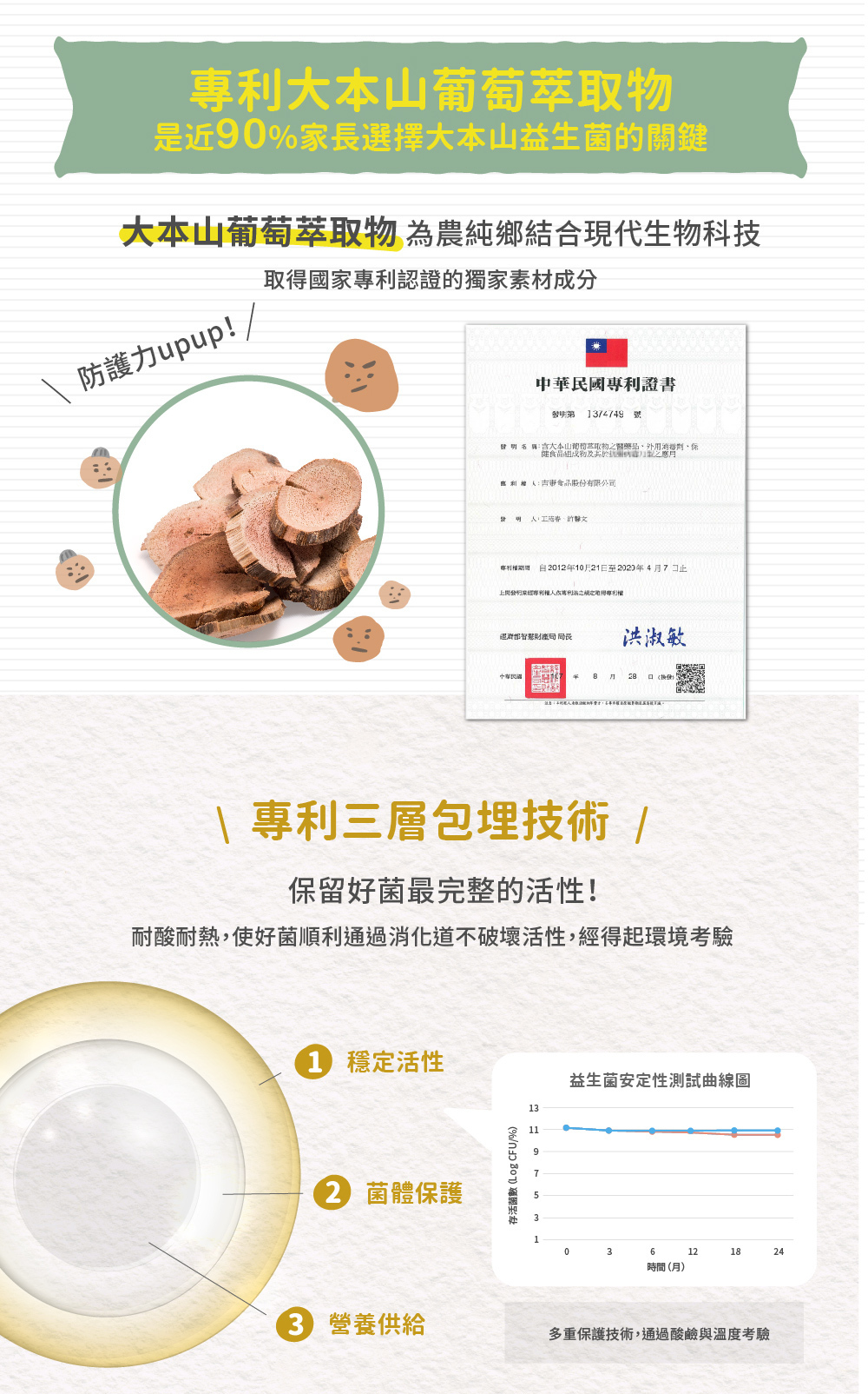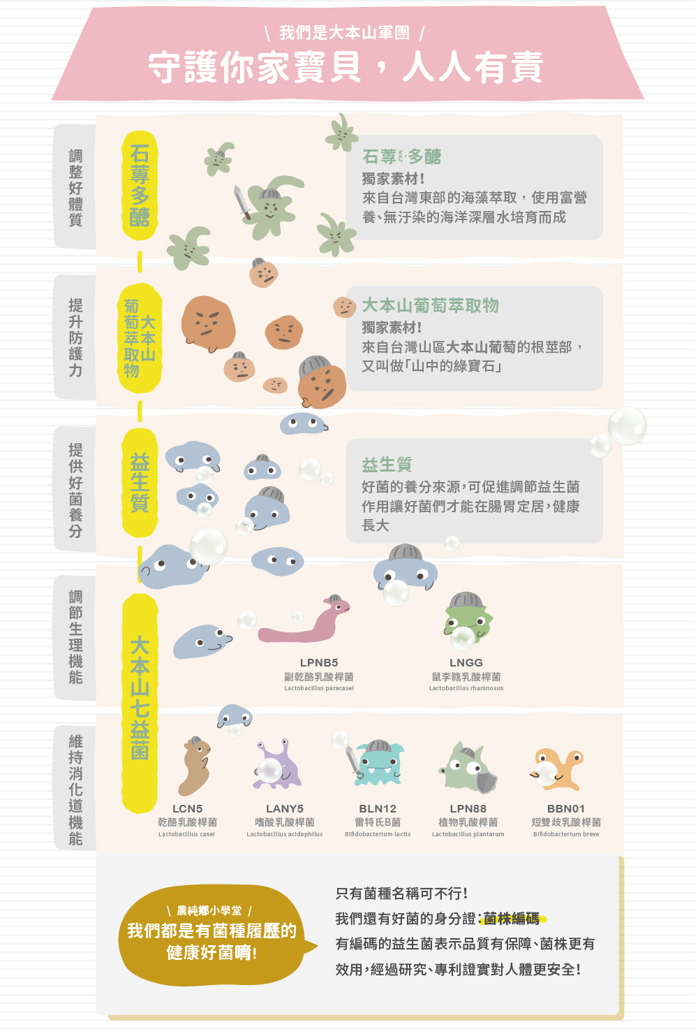 成份:玉米淀粉、细砂糖、大本山葡萄萃取物ABT1001(大本山葡萄萃取物、麦芽糊精)、草莓果汁粉(草莓浓缩汁、麦芽糊精)、大本山七益菌(干酪乳酸杆菌Lactobacillus casei、植物乳杆菌Lactobacillus plantarum、鼠李糖乳杆菌Lactobacillus rhamnosus、副干酪乳杆菌Lactobacillus paracasei、雷特氏B菌Bifidobacterium lactis、短双歧杆菌Bifidobacterium breve、嗜酸乳杆菌Lactobacillus acidophilus)、菊糖、草莓果粒、脱脂奶粉、维生素C、木寡糖、石莼多糖