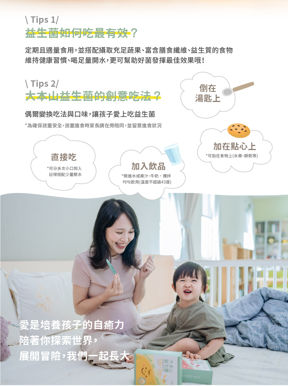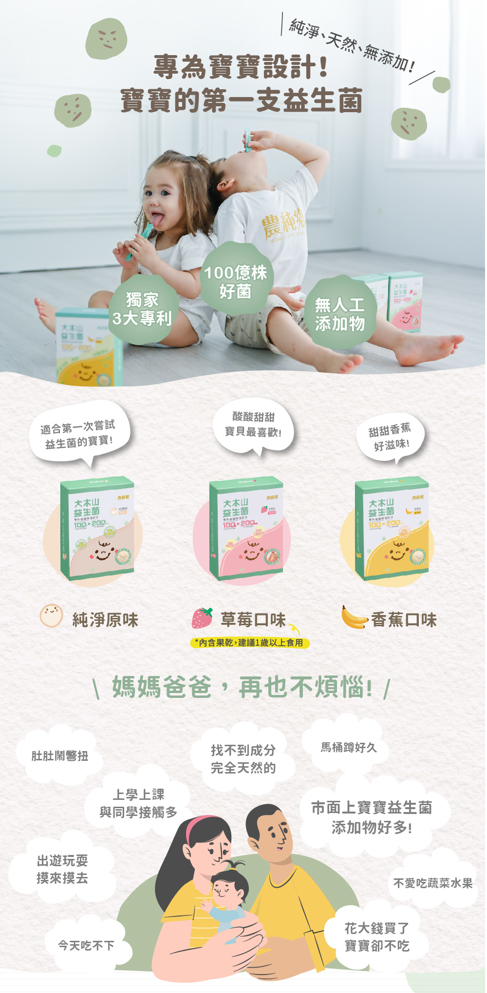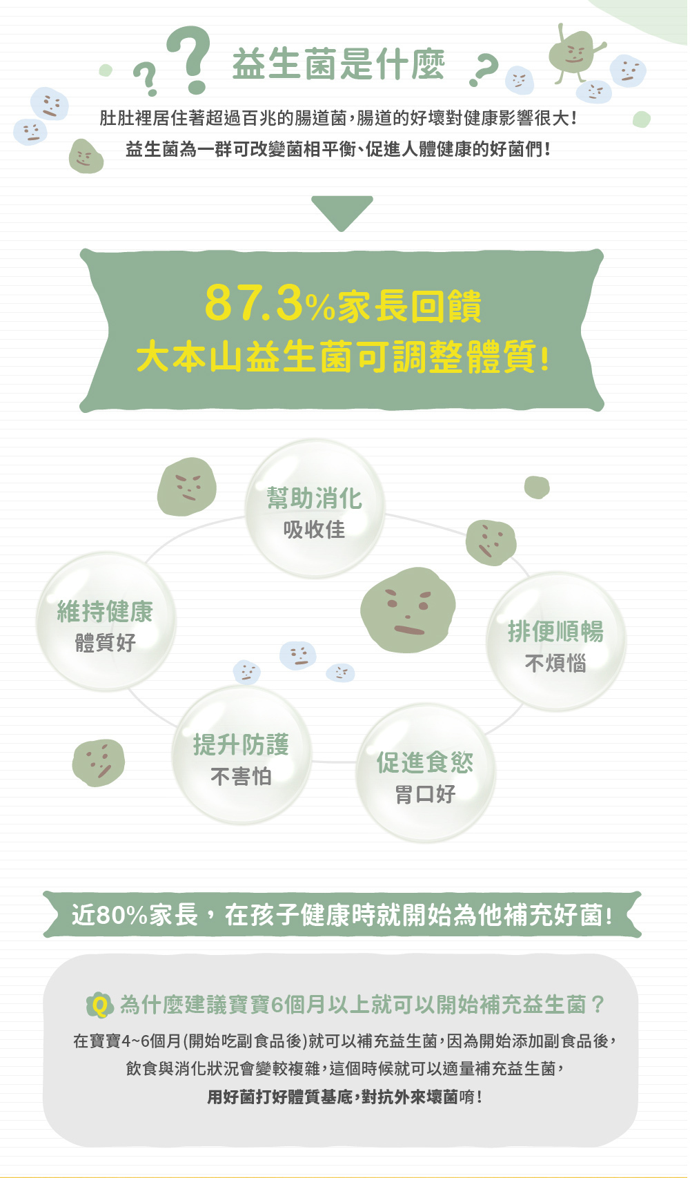 成份:玉米淀粉、细砂糖、大本山葡萄萃取物ABT1001(大本山葡萄萃取物、麦芽糊精)、草莓果汁粉(草莓浓缩汁、麦芽糊精)、大本山七益菌(干酪乳酸杆菌Lactobacillus casei、植物乳杆菌Lactobacillus plantarum、鼠李糖乳杆菌Lactobacillus rhamnosus、副干酪乳杆菌Lactobacillus paracasei、雷特氏B菌Bifidobacterium lactis、短双歧杆菌Bifidobacterium breve、嗜酸乳杆菌Lactobacillus acidophilus)、菊糖、草莓果粒、脱脂奶粉、维生素C、木寡糖、石莼多糖
