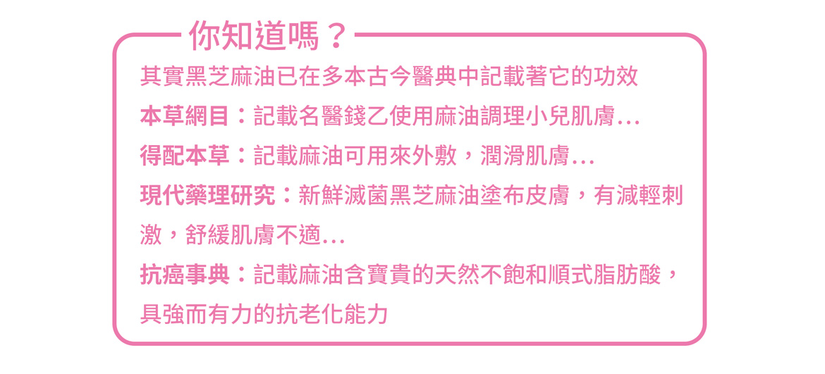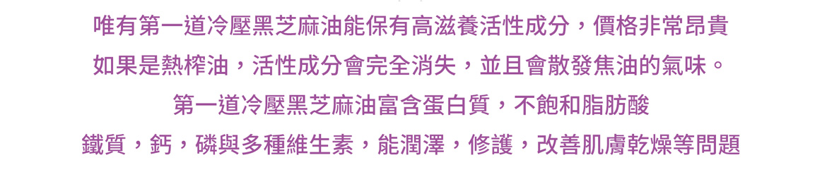 - 以冷压初榨黑麻油 ,搭配高品质的植物萃取做成